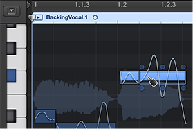 При выборе алгоритма Flex Pitch для трека в Audio Track Editor (Трековом аудиоредакторе), все аудиосегменты на этом треке, которые определились в виде отдельных нот, отображаются так же, как отображаются ноты в редакторе Piano Roll. В Audio Track Editor вы можете редактировать высоту, временну́ю позицию и длительность нот во многом таким же образом, как и при работе в редакторе Piano Roll. Вы также можете вырезать ноты и объединять несколько нот в одну.
