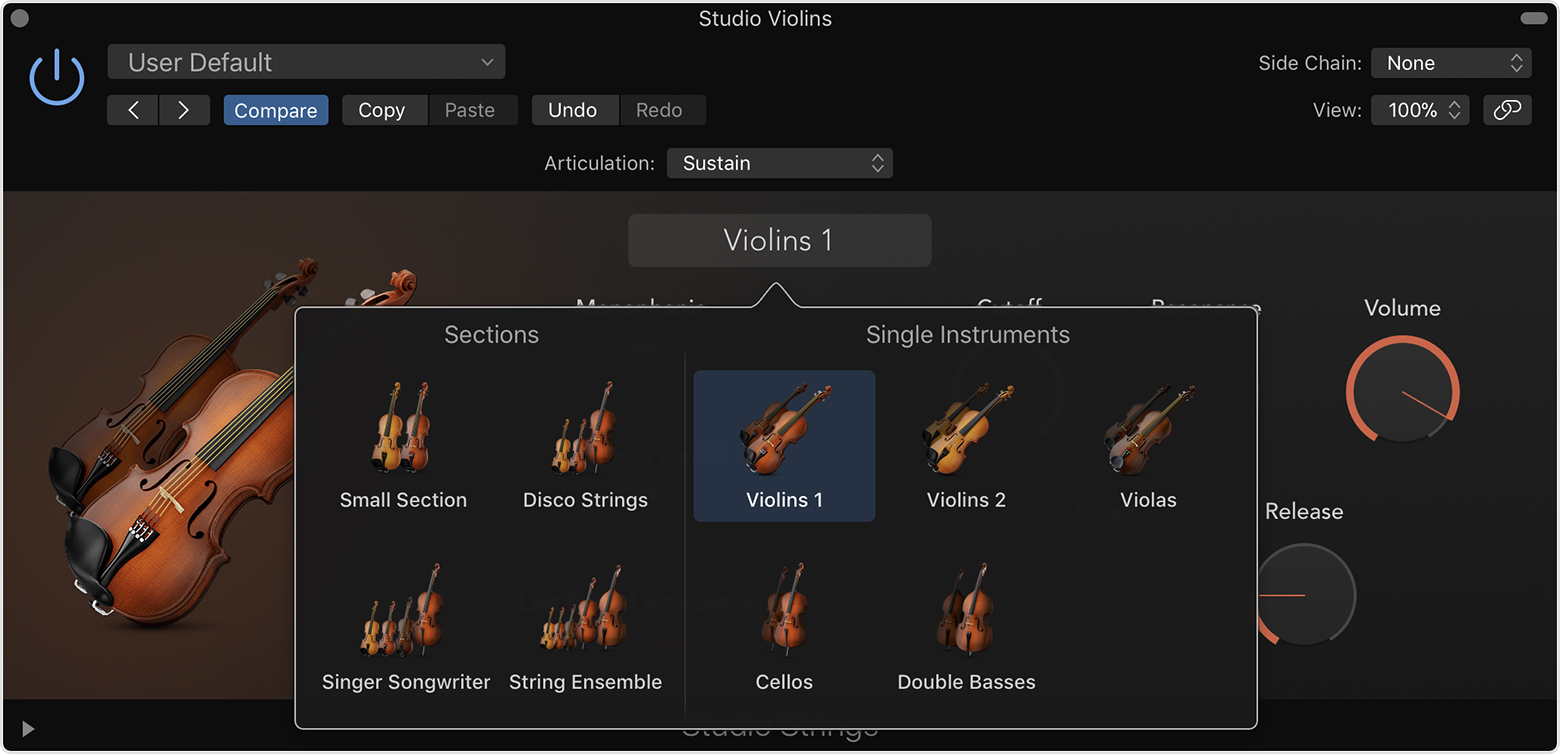 В пакет приложения Logic Pro X 10.4 входят плагины Studio Horns и Studio Strings — тщательно сэмплированные ансамблевые инструменты с настраиваемыми элементами управления артикуляцией.