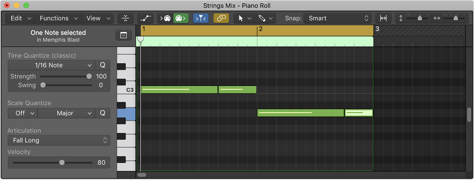 Вы можете создать плавное глиссандо вниз или вверх с помощью Piano Roll (Клавишный редактор). Чтобы загрузить артикуляционный набор, сначала выберите патч для инструментов серии Studio, используя библиотеку Library. В редакторе Piano Roll добавьте вторую ноту с той же самой высотой тона непосредственно после любой ноты. Выделите вторую ноту в редакторе, затем выберите Fall Short (Короткое глиссандо вниз), Fall Medium (Среднее глиссандо вниз) или Fall Long (Долгое глиссандо вниз) или Doit (Глиссандо вверх) во всплывающем меню Articulation (Артикуляция). Разрыв между этими двумя нотами должен быть минимальным.